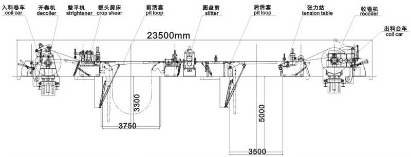 Coil-loading—Hydraulic uncoiling——Coil-end-feeding & shoveling——Double-roller pinch feeding——End-cutting----Hole Accumulator 1——Strip-aligning----Disk slitting——Scrap reeling——Hole Accumulator 2——Pre-separator / Tensioner——Separating, Recoiling——Coils-discharging——Hydraulic control——Electric control